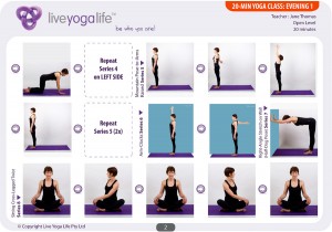 Evening Class 1 – Calm & Centring: This practice can be done at any time to help release and reverse the tensions that have built up in your body during the course of your working day. For example a simple lunge will stretch out those tight hip flexor muscles that have contracted by sitting all day at your desk.